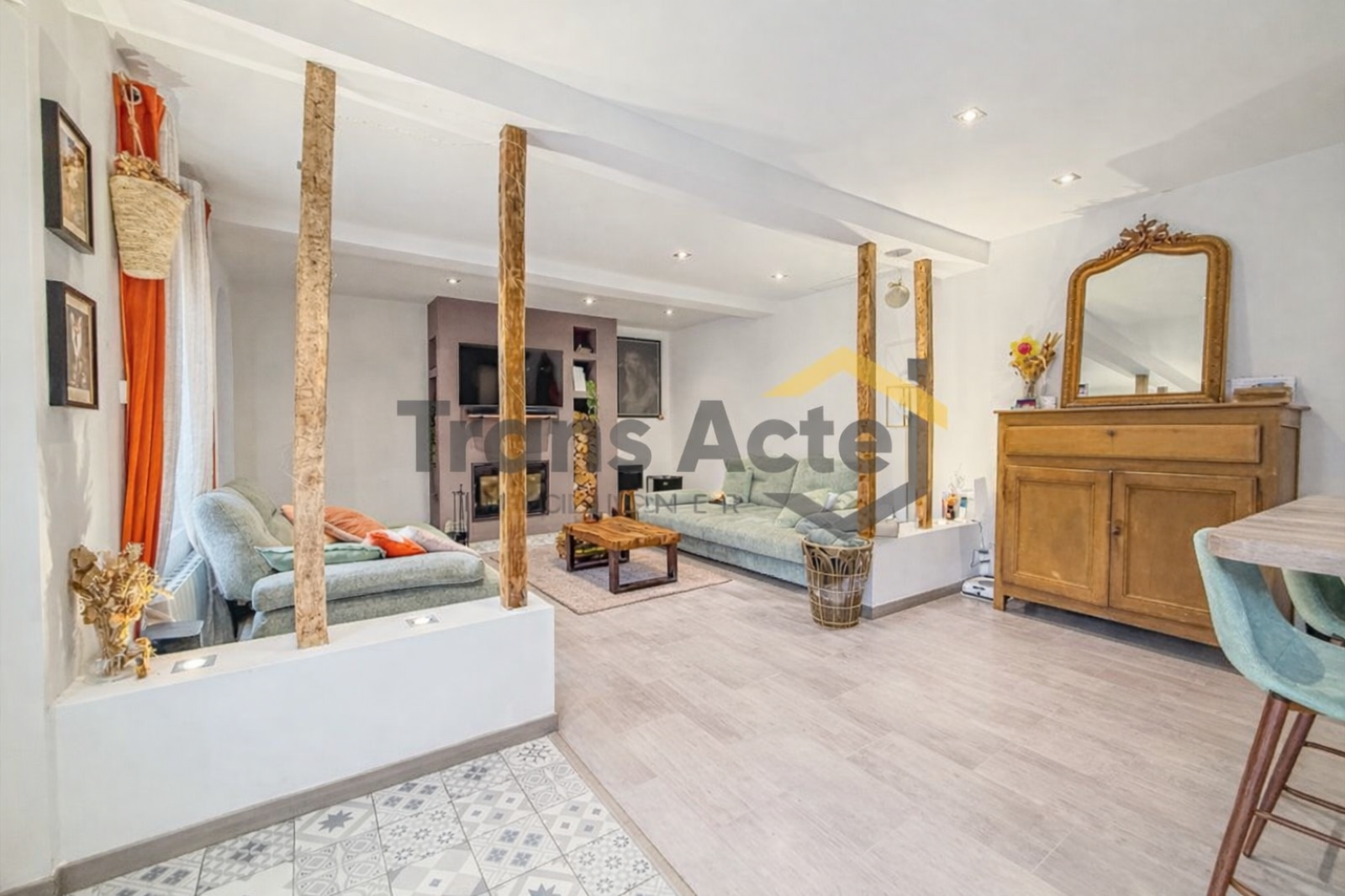 D’une surface de 105 m² loi Carrez et 124 m² au sol, ce bien séduit dès l’entrée par un vaste salon-séjour lumineux, baigné de lumière, et agrémenté d’une cheminée insert fonctionnelle.